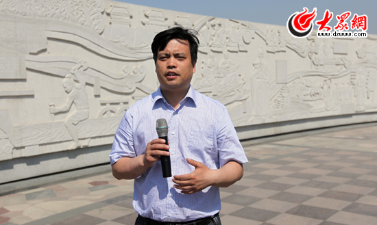 ????棗莊市中區區委常委、宣傳部長王光明介紹東湖公園(全民健身中心)相關情況。(盛堃 攝影)
