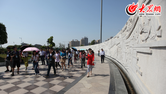 ????采訪團記者參觀采訪東湖公園內的文化墻。(盛堃 攝影)