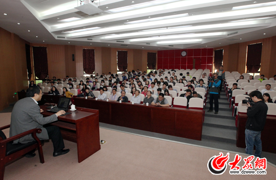 采訪團記者在報告廳內聽取情況介紹。(盛堃 攝影)