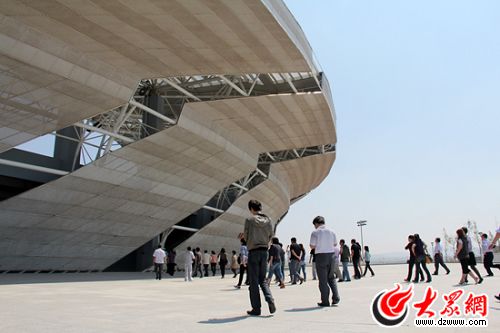 在離文登市體育公園還有幾百米的時(shí)候,記者們就對(duì)著前方的銀白色圓形建筑物發(fā)出感嘆:“快看!那個(gè)建筑真漂亮!”文登市城鄉(xiāng)建設(shè)局的孫丹丹笑著告訴大家,這座建筑就是文登市體育公園,而它的設(shè)計(jì)單位就是奧運(yùn)場(chǎng)館“鳥(niǎo)巢”的中方設(shè)計(jì)單位——中國(guó)建筑設(shè)計(jì)院設(shè)計(jì)的。