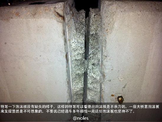 ??? 收到網友爆料之后,青島市人民政府新聞辦公室官方微博反應迅速,5月19日18時26分,官方微博“青島發布”做出回饋:“今天,不少網友@青島發布,稱青島一處立交橋出現斷裂縫隙,露出泡沫填充物。立交橋可以使用泡沫嗎?斷裂縫隙是否會影響車輛和行人的安全?網友提出疑惑和擔心。@青島私家車地圖 說這是必須的伸縮縫處理材料,施工有點不規范,但安全無虞。有做工程的童鞋可以解釋下嗎?”