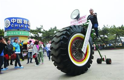 ????“棧橋附近有人在展示一輛超大的自行車,那個(gè)前輪比我的個(gè)子還高呢!”昨天下午,在棧橋附近游覽的游客和市民都被棧橋廣場西側(cè)一輛巨大的自行車吸引。記者聞訊趕到棧橋西側(cè)的觀景廣場,兩名中年男子正輪流駕駛一輛超大型的自行車向過往的市民和游客展示。