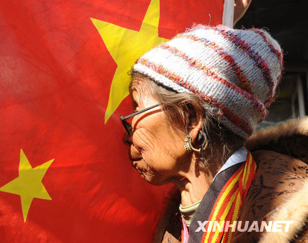 資料圖片:2009年4月5日,老阿媽次仁曲珍虔誠地與天安門國旗護衛隊贈送的國旗碰頭。