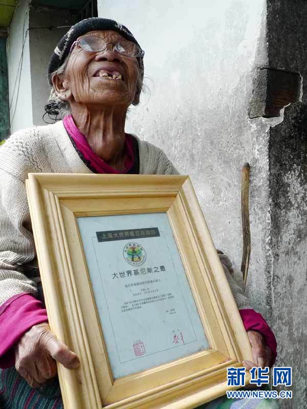 資料圖片:老阿媽2009年9月被上海大世界基尼斯總部授予“每日升國旗持續(xù)年數(shù)最長的人”。她說:“能活到今天,全靠共產(chǎn)黨、解放軍”。