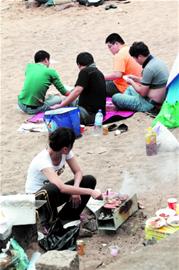 ????青島雕塑園管理辦公室的陶主任告訴記者,去年主要是周末有人來燒烤,今年不但周末人數(shù)增加到上百人,平常每天也都有20多人,人數(shù)比去年增加了五成多。“我們8名保安根本不夠用,攆走了這撥,又來了那撥,態(tài)度好的換個地方繼續(xù)燒烤,態(tài)度不好的連聽也不聽。”陶主任說,每一次燒烤對環(huán)境都是一次傷害,除了玻璃碴子、鋼釬子容易傷人外,燒烤后撒漏的油污更是難以清除,20名環(huán)衛(wèi)工人每天要清理出1噸多燒烤垃圾,不少油污都是工人手把手地從沙子里摳出來的。