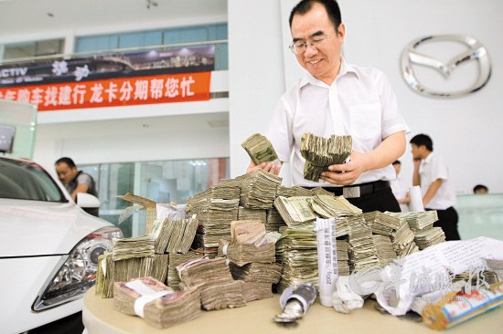29日上午,在河南新宏源汽車銷售公司內,銷售經理王先生告訴記者,張先生選中一款15.38萬元的轎車。28日下午,張先生來提車,“從車上搬下了十多箱零錢,說大概有10萬元,讓我們點點