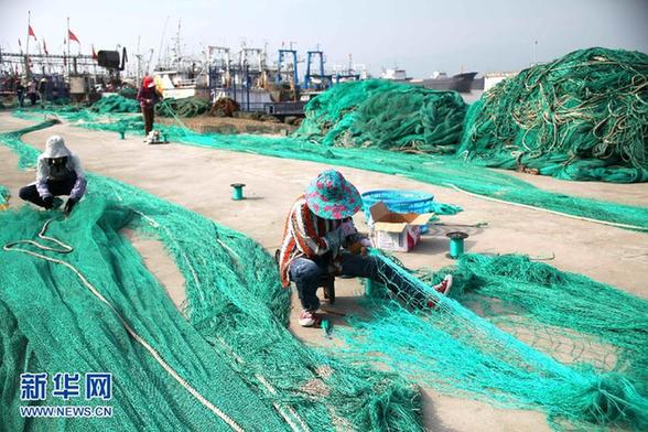 6月1日,休漁的漁民在浙江省瑞安市東山漁港碼頭修補(bǔ)漁網(wǎng)。