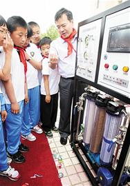 一臺機器完全是透明玻璃制成的,一個玻璃方框里放著一支像船槳似的東西;另一臺機器上則像一臺巨型電表,不同的是,上面有紅紅綠綠的好多按鈕,還有好幾個復(fù)雜的儀表盤。“聽說海水進去了轉(zhuǎn)一圈出來就能直接喝!”孩子們上前把兩部機器圍了個水泄不通,還纏著老師們問東問西。看到學(xué)校科技老師有些問題答不出來,國家海洋局科技司副司長雷波連忙上前充當(dāng)起了臨時講解員。在雷波深入淺出的介紹下,孩子們五花八門的問題一一得到了權(quán)威答案,這才感到心滿意足。