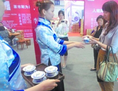 茶博會現場,茶藝表演人員給市民敬茶。