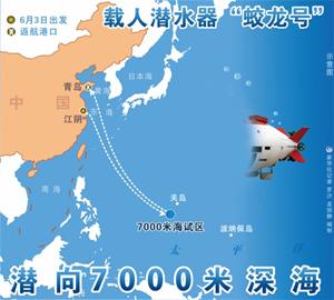????昨天上午9時,“蛟龍號”中國載人潛水器7000米級海試在江蘇省江陰市蘇南國際碼頭舉行起航儀式。目前,中國是繼美、法、俄、日之后世界上第五個掌握大深度載人深潛技術的國家,如果這次7000米級海試成功,將創造世界作業類載人潛水器的最大下潛深度。