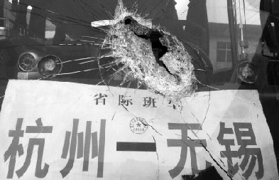 大客車(chē)的擋風(fēng)玻璃上,安放著兩塊牌子,一是“杭錫平安文明線”,一是“省際班車(chē),杭州-無(wú)錫”。被飛來(lái)鐵片擊中的部位處于“杭州-無(wú)錫”牌子的正上角,剛好對(duì)準(zhǔn)的是方向盤(pán)。一條狹長(zhǎng)的小洞,破損向外擴(kuò)散成蜘蛛網(wǎng)狀的“傷疤”。
