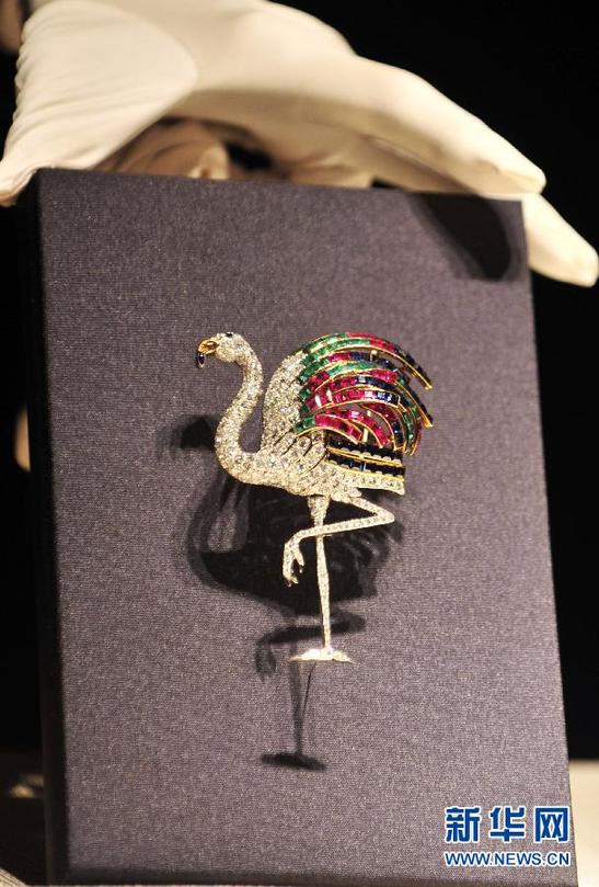 6月4日,工作人員在臺北故宮博物院圖書文獻大樓開箱展示20世紀(jì)英國溫莎公爵夫人佩戴過的“火鶴胸針”。