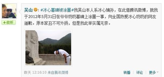 昨日上午11時40分左右,吳山在首篇博客中的第一句就是“我本人吳山,系冰心嫡孫。在此借博客,就2012年5月31日我在爺爺奶奶墓碑涂墨一事,向全國喜歡冰心奶奶的網友道歉。原本家丑不可外揚,我的行為實屬無奈。”