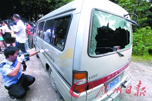 “有人打爛我的車?!碑?dāng)記者們正在非法拼裝摩托車的工廠內(nèi)進(jìn)行采訪時(shí),佛山電視臺(tái)的司機(jī)彭師傅沖到廠門往里喊。現(xiàn)場執(zhí)法人員和記者連忙出去,只見電視臺(tái)的面包車后窗玻璃被砸了個(gè)大窟窿,玻璃片在車內(nèi)外散落。