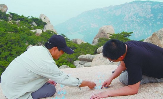 ????在巨石東北側,記者勉強看到有兩行紅色的字體,這就是孫曇刻石,此前紅色粉筆描摹過的顏色已經很淡,部分石刻露出原色。由于巨石十分傾斜,嶗山區文化局一名工作人員在腰上綁上安全繩,其他幾人在高處拉住繩子,讓他一點一點試探著從斜面上往下挪,同時用藍色的粉筆將刻石一筆一劃描出。“這地方確實太險要了,真佩服當時古人是怎么刻出這些字的。”工作人員稱。
