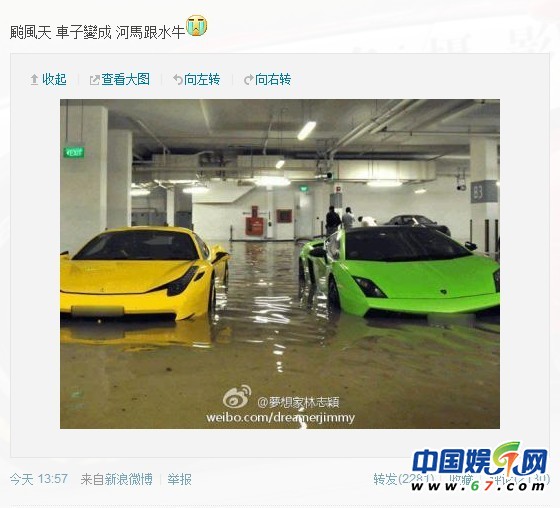 林志穎今日下午在微博曝自家車庫被淹畫面,照片中他的兩臺豪車均已被暴雨浸泡。