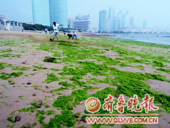 ????12日,大量滸苔出現在青島第三海水浴場。15時,記者在第三海水浴場看到,沙灘上鋪滿了沖上岸的滸苔,工作人員正在清除。據浴場負責人李永順介紹,浴場最近幾天一直有滸苔出現,但數量相對較少。當天上午,隨著潮水上漲,沙灘上突然涌上了大量滸苔,到下午的時候,已經運走四五車了。記者在第一海水浴場和第二海水浴場并未看到滸苔,第六海水浴場和八大關出現了少量滸苔。