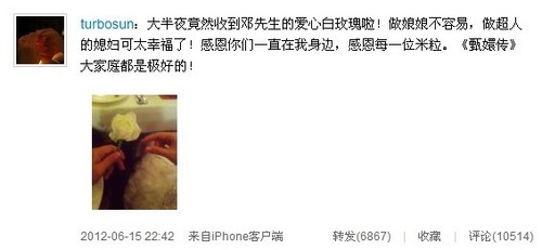 雖然錯失“白玉蘭”視后,但有老公鄧超送上的白玫瑰貼心安慰,她也開心地表示當“超人的媳婦”很幸福,在22:42發布的微博中,她說:“大半夜竟然收到鄧先生的愛心白玫瑰啦!做娘娘不容易,做超人的媳婦可太幸福了!感恩你們一直在我身邊,感恩每一位米粒。《甄嬛傳》大家庭都是極好的!”同時她拍攝了一張手持白玫瑰的照片,看來心情依然幸福。