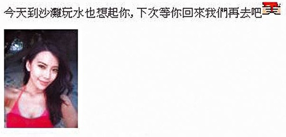 余文樂到上海出席電影節期間,LuLu在微博留言:“到沙灘玩水也想起你”,又相約他回來一起再去。