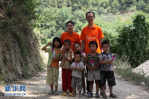 2011年8月,伏明霞(后排左)以“國際小母牛”愛心大使的身份與其丈夫、慈善機構“國際小母牛”香港分會主席梁錦松(后排右)參加小母牛貴州探訪團。