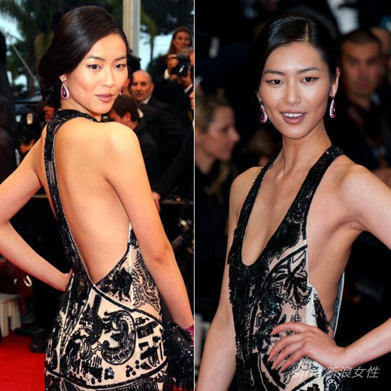 當?shù)貢r間2012年5月20日,法國戛納,影片《愛》首映紅毯,中國超模劉雯黑色低胸禮服亮相紅毯,露背的掛脖設計更顯光彩照人。