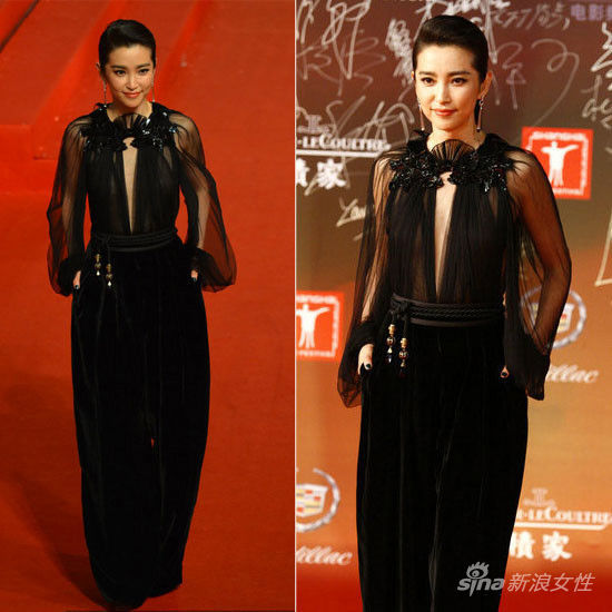 李冰冰身著GUCCI(微博)2012秋冬系列改良款黑色禮服裙亮相。簡單利落的直發馬尾,優雅不失帥氣感,以簡單的發型襯托性感的透視禮服裙,更充滿華麗色彩。