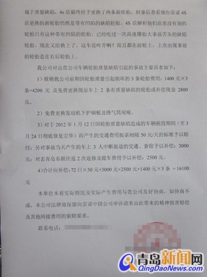 記者又聯(lián)系了青島東聯(lián)雷諾4S店,負(fù)責(zé)售后索賠的一位工作人員崔女士表示:“李先生的車在青島前后保養(yǎng)、維修過三次,而大部分時(shí)間其實(shí)是在煙臺做車輛養(yǎng)護(hù)的。在李先生的車出事故之前,車胎曾有過鼓包,李先生自己找到雷諾車使用的輪胎廠家馬牌,更換了三條車胎,所以發(fā)生事故后車胎再有問題,已不是雷諾的出廠車胎了,即使向廠家申訴也不能更換。另外,廠家現(xiàn)在也沒有車胎的鑒定資格,車主想鑒定車胎,只能找大型輪胎廠察看,或向馬牌輪胎廠家申訴協(xié)調(diào)。”