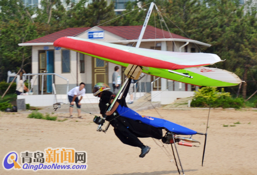 據了解,王勇8點30分從開發區金沙灘海水浴場起飛,原定1小時飛抵石老人。恰逢天公作美,飛行時間比預定縮短了一半,9點整王勇已經出現在石老人海水浴場。談起此