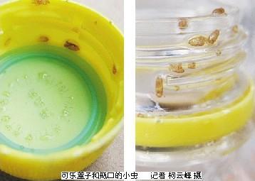 一看嚇了一跳,“居然是一些叫不出名字的小蟲子”。隨后,袁先生又打開了一瓶可樂,在瓶口和瓶蓋處也發現了類似小蟲。