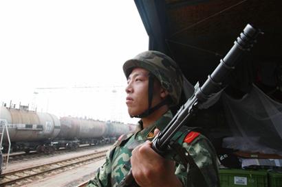 按照火車的調(diào)度,火車需要編組,每次編組短則兩三個(gè)小時(shí),長(zhǎng)則七八個(gè)小時(shí),此時(shí)武警戰(zhàn)士開始執(zhí)勤巡守?;疖嚨郎系臍鉁赜?0℃,而車廂內(nèi)的溫度卻高達(dá)50℃,戰(zhàn)士們?nèi)蔽溲b在悶罐車?yán)锔叨染?,?yán)防各種意外。