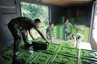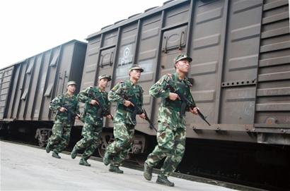 “咣當(dāng)”一聲,7月16日下午,隨著車廂門砰然關(guān)閉,武警官兵開始了長(zhǎng)達(dá)3天3夜的押運(yùn)生活。戰(zhàn)士們個(gè)個(gè)全副武裝,頭戴鋼盔,身穿防彈衣,手持重武器。站不穩(wěn)又坐不下的武警戰(zhàn)士,只能半靠在箱子上面?;疖嚥煌5?fù)u晃,箱子一會(huì)兒移開,一會(huì)兒又?jǐn)D撞在一起,手臂貼在上面,一不小心就被夾住一塊皮肉,有時(shí)火車一個(gè)急轉(zhuǎn)彎,巨大的慣性作用下,頂層的箱子就飛下來,稍不留神就得“掛彩”。夜色漸漸拉下了帷幕,火車轟隆隆地行進(jìn),車輪摩擦著鐵軌發(fā)出“咔嚓咔嚓”的聲音。透過通風(fēng)孔看去,外面漆黑一片,除了站臺(tái)上呼嘯而過的燈火什么都看不到,耳邊是轟鳴的火車開動(dòng)聲,身上是前仆后繼的蚊子大軍。