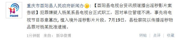 微博內容稱,犯罪嫌疑人楊某系酉陽縣電視臺正式職工,因對單位管理不滿,事先將電視節目惡意篡改, 植入境外淫穢影片片段。7月19日,酉陽縣檢察院以傳播淫穢物品罪對楊某批準逮捕。