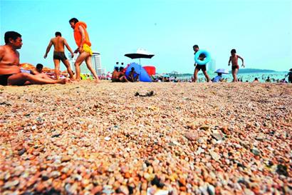昨天,記者來到了第一海水浴場。靠近馬路一側的沙灘遠看是黃白色的沙子,走近一看卻是如綠豆大小的石子,還摻雜了一些海蠣子皮,腳踩在上面有一種麻酥酥的感覺。繼續往大海的方向走去,取而代之的是沙子和石子混合在一起的“沙灘”,走起來硌腳的感覺會輕一些。在較為濕潤的靠近海的地方,地上的沙灘都是一些白色、半透明的石子細沙。調查發現,一浴東西兩側的沙質有所不同,浴場的東側沙灘沙質比較細膩,西側沙灘則較粗。