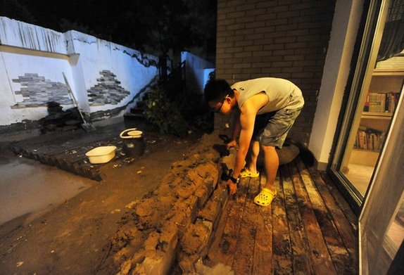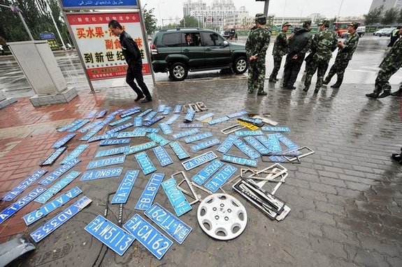 7月30日,在寧夏銀川城區(qū)的一條街道上堆放著大批被暴雨沖擊出來的汽車車牌。