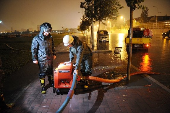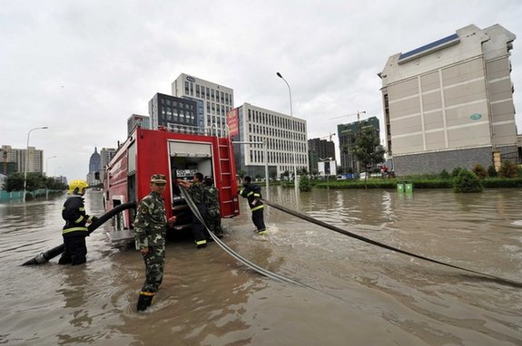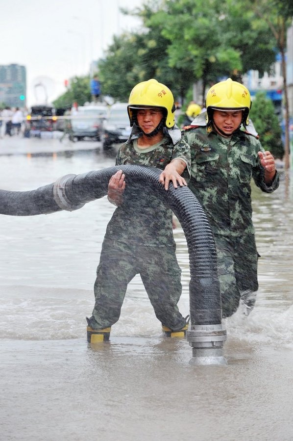 7月30日,在寧夏銀川城區(qū)的一條路面嚴(yán)重積水的街道上,消防官兵在搶險(xiǎn)排澇。