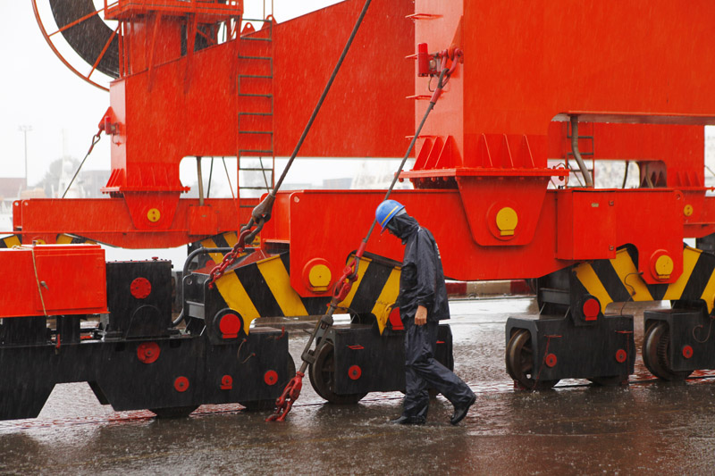 8月3日,凌晨3點(diǎn)20分,雨勢(shì)間歇,風(fēng)力驟增。肆虐的狂風(fēng)無(wú)情的吹刮著岸邊的大型設(shè)備,機(jī)械四隊(duì)隊(duì)長(zhǎng)于秀光正帶領(lǐng)當(dāng)班職工逐個(gè)查看每一臺(tái)門(mén)機(jī)的防風(fēng),從錨定、步固緊到防風(fēng)鋼絲繩,不放過(guò)任何一個(gè)細(xì)節(jié)。