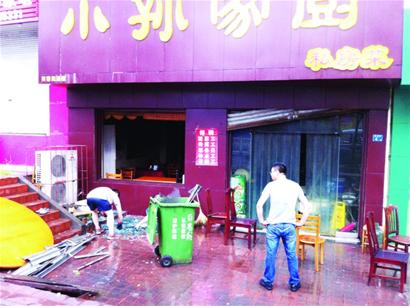 昨晨6時許,記者接到市民報料后趕到現場,消防戰士已經將火撲滅離開。這家菜館臨街6平方米的玻璃已經被砸碎,卷簾門也被割開一
