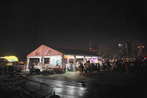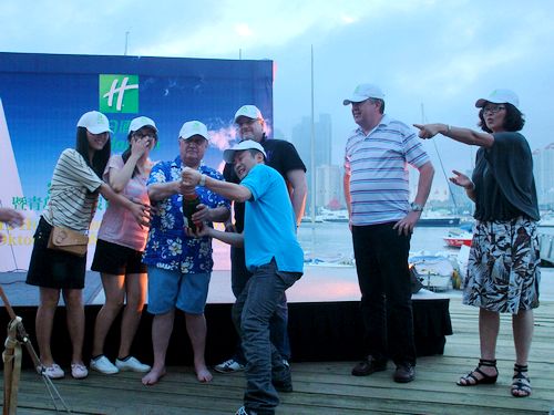 上周六晚上的奧帆中心,岸上的游人被海邊木質平臺上的景象吸引。平臺上嘉賓頻頻舉杯,歡聲不斷,原來這是城陽景園假日酒店在搞