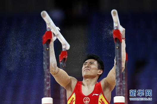 7月25日,中國體操隊選手滕海濱在進行雙杠訓練。當日,中國體操隊在倫敦O2體育館備戰。本屆奧運會體操比賽將于7月28日開戰。