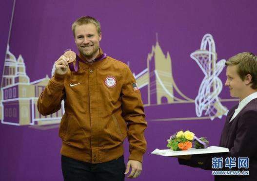 8月6日,埃蒙斯在頒獎(jiǎng)儀式上展示獎(jiǎng)牌。當(dāng)日,在倫敦奧運(yùn)會(huì)男子50米步槍三姿決賽中,美國(guó)選手埃蒙斯以1271.3環(huán)的總成績(jī)獲得季軍。
