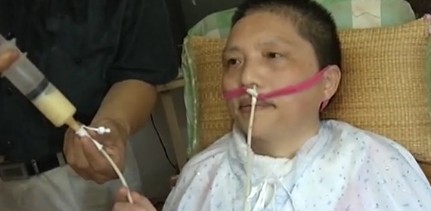 ????妻子董寶華不能吃飯,何衛平要用注射器,把牛奶、果汁通過她的鼻子注入胃里。