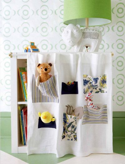 現成的較長的布簾剪成合適的長度,掛在書架前擋灰塵。別忘記在簾子正面縫些彩色布口袋,充滿樂趣。