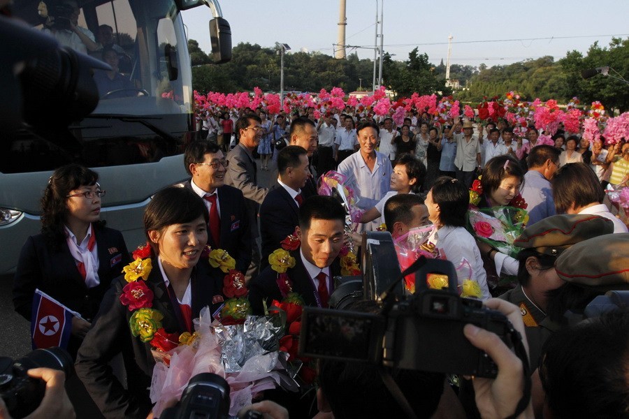 當地時間8月16日,獲得倫敦奧運會金牌的朝鮮運動員乘機回國。他們首先瞻仰設在機場的金日成和金正日太陽像,鞠躬致意。在駛向市區的數十里沿途都有朝鮮民眾夾道歡迎,慶祝朝鮮選手凱旋歸來。運動員代表發言時表示,將更加努力地訓練,報答金正恩的巨大關愛和信任。