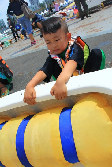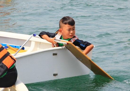 本次女子組的比賽現(xiàn)場(chǎng),卻一位留著可愛瓜瓢頭的小男孩得到了全場(chǎng)的格外關(guān)注,他體型特別瘦小,大腦袋,曬得黑黑的,出發(fā)前緊緊抓著船舷,緊張的樣子萌態(tài)十足,現(xiàn)場(chǎng)觀眾們都叫他“小蘿卜頭”。記者了解到,這是本次比賽最小的選手,只有4歲,名叫多多,來自南京。之前的訓(xùn)練都在南京的玄武湖,這是他第一次到大海中航行。記者問,緊張嗎?多多皺著眉頭考慮了一下,然后鄭重的點(diǎn)點(diǎn)頭。