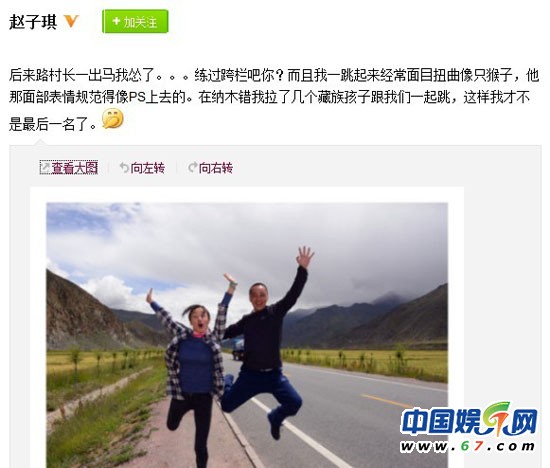 近日,趙子琪與老公路金波同游西藏,并頻頻曬旅游私照,張張搞怪賣萌,幸福生活羨煞眾網(wǎng)友。趙子琪微博原文:后來(lái)路村長(zhǎng)一出馬我慫了。。。練過跨欄吧你?而且我一跳起來(lái)經(jīng)常面目扭曲像只猴子,他那面部表情規(guī)范得像PS上去的。在納木錯(cuò)我拉了幾個(gè)藏族孩子跟我們一起跳,這樣我才不是最后一名了。