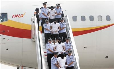 昨日,北京首都國(guó)際機(jī)場(chǎng),涉案犯罪嫌疑人從安哥拉押回北京。這些嫌疑人涉嫌從事綁架、搶劫、敲詐勒索、拐騙婦女強(qiáng)迫賣淫等犯罪。新京報(bào)記者劉剛 攝