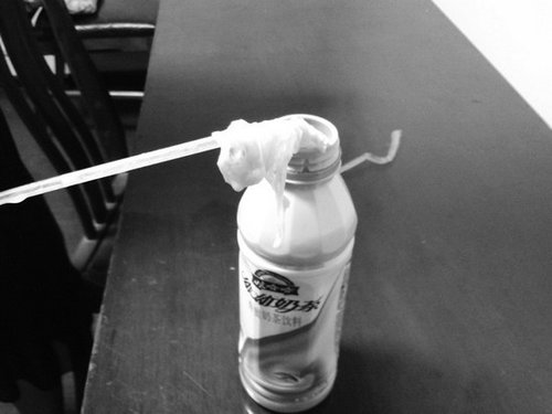 ????????奶茶瓶里挑出塑料袋 記者韓波攝