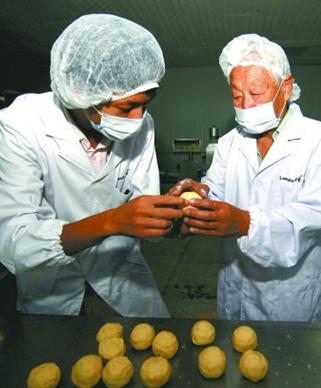 ????為防止皮料沾手,正式包月餅前,先要在加工臺上撒上少許補面。“先將面塊按成面餅,再將餡料放到面餅里面,慢慢將餡料揉進去。”高老先生說,包餡的時候要注意兩個問題,首先是外皮要均勻,不能有厚有薄,否則做出來的月餅也是厚薄不均。另外,要注意皮和餡之間不能有空隙,否則放到模具里壓制的時候月餅皮會被里面的空氣沖破。