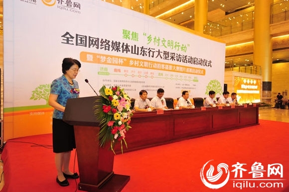 ????啟動儀式由省委宣傳部副部長李建軍主持。省委宣傳部副部長、省文明辦主任劉寶蒞介紹了山東鄉村文明行動的開展情況。劉寶蒞說,山東是經濟大省、文化大省,也是農業大省。改革開放以來,特別是近年來,在省委、省政府的正確領導下,山東農村正在發生歷史性變化,廣大農民在衣、食、住、行和文化教育等方面得到了根本改善,社會主義新農村建設在積極推進。為進一步提高全省農村精神文明建設水平,扎實推進社會主義新農村建設,2011年4月,省委、省政府在全省農村啟動了“鄉村文明行動”。以“村容村貌建設、村風民俗建設、鄉村道德建設、生活方式建設、平安村莊建設、文化惠民建設”等6大建設為重點,努力建設“富裕文明、和諧安定、生態良好、環境優美”的社會主義新農村。開展一年多來,各項工作扎實推進,開局良好。山東省網絡文化辦公室主任劉致福介紹了采訪活動的組織情況和行程安排,山東廣播電視臺黨委書記魏紹水代表承辦方致辭。