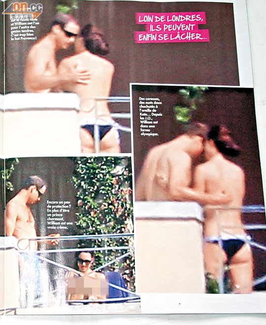 雜志封面與內頁均刊登多張相片,可見凱特在泳池邊脫掉比堅尼的上截,露出雙峰,胸前兩點亦被清楚拍下,美好身材表露無遺,雜志亦來贈興:“Victoria's Secret的模特兒可以靠邊站了。”其他照片可見上身裸露的凱特與威廉互涂太陽油,而且一邊享受日光浴,一邊輕輕細語。凱特后來把比堅尼下截也脫下一半,露出圓渾臀部,相信是不想在曬太陽后留下泳衣印。